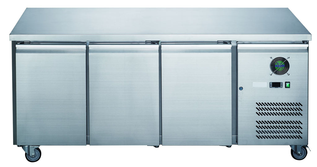 This commercial freezer is ideal for running a busy business and is sought after for its reliability and performance. Ideal choice for restaurants, cafes, fast food operations, butcheries, and convenience stores. With fan-forced cooling that ensures even distribution of the cool air, there will be no warm spots, and your food will be safe. This unit is designed for you to be able to maximize the internal space. You can place it under an existing counter or place it against the wall. Equipped with heavy-duty castors ( brake type at the front), you can easily move the unit out for cleaning or maintenance. Constructed with a stainless steel interior and exterior, your unit is easy to clean and is made strong to withstand the rigours of a busy operation. All 3 doors are self-closing and fitted with heavy-duty magnetic seals to retain food's optimal quality. You can set the temperature a single degree at a time with its user-friendly digital control. This unit is GN compatible and comes with a single shelf, but you can opt for additional slides so your pans just slide in and out. We can provide Splashback tops as well as a 2 and 3-drawer option instead of a door, which is available upon request. This underbench fridge’s build quality, specifications, and functionality meet food, health, and safety standards.