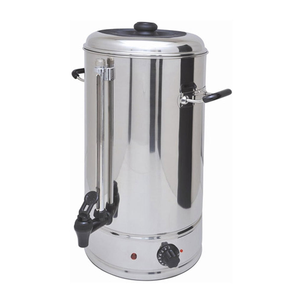 The water urn features a mirror-finish stainless steel body and delivers reliable hot water with a powerful concealed heating element for easy cleaning. The rotary dial allows intuitive and precise working temperature control from 30 to 100°C, with an automatic limiter for boil protection. Dual indicator lights signal heating and keep-warm modes, while the non-drip tap with water level ensures clean dispensing. A heat-resistant Bakelite-wrapped stainless steel handle enhances safety during use. Ideal for offices, catering events, community centres, and hospitality venues requiring consistent hot water service.